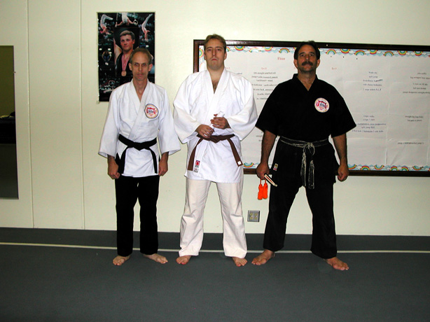 Me receiving my Brown Belt at the Kodenkan Jujitsu Dojo in June, 2002. Left is Sensei Clive Guth, right is Professor Tony Janovich, my instructors.